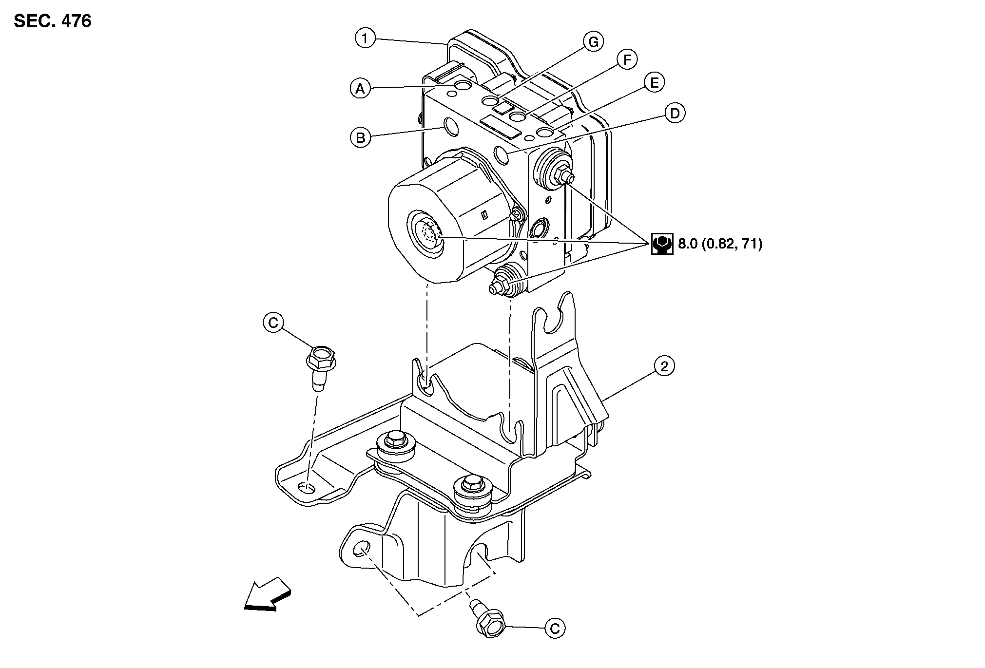 | 1. | ABS actuator and electric unit (control unit) | 2. | Bracket | A. | To rear (RH) brake caliper. Refer to Exploded View. |