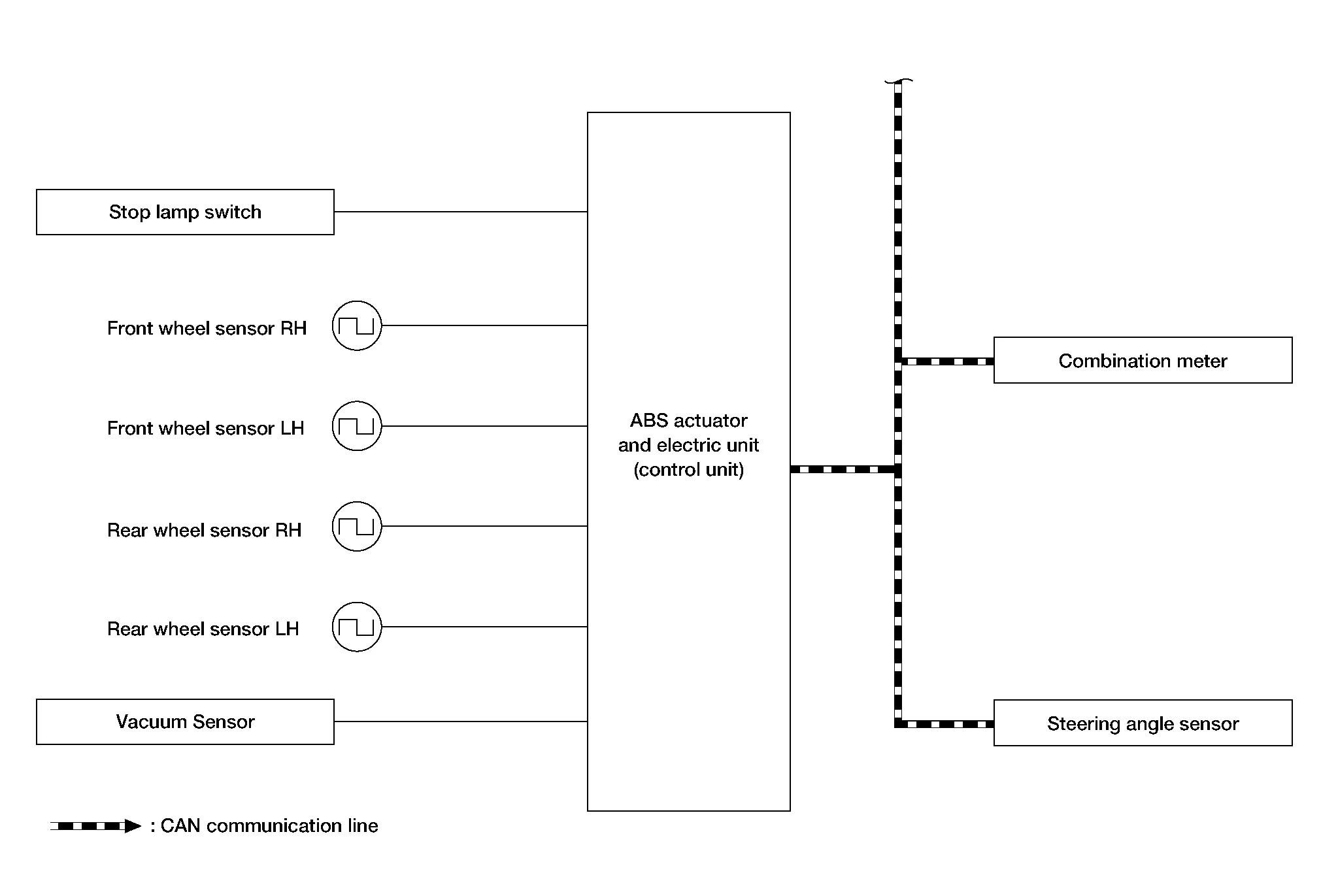 Mainly receives the following signals from ABS actuator and electric unit (control unit) via CAN communication: