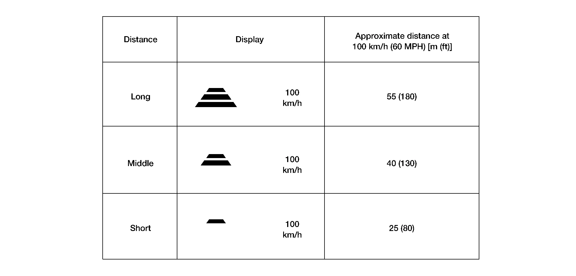 Check that the set distance indicator changes display in order of: (Long) → (Middle) → (Short).