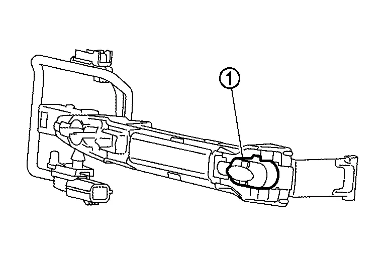 Front door request switch (LH) (1) is integrated into the front outside handle assembly LH.