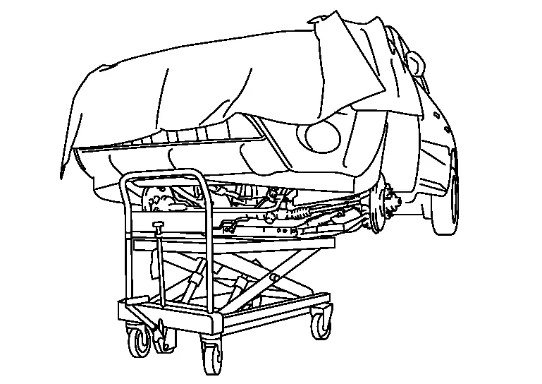 Carefully lower table to remove the engine, the transmission and the front suspension member. When performing work, observe the following caution: