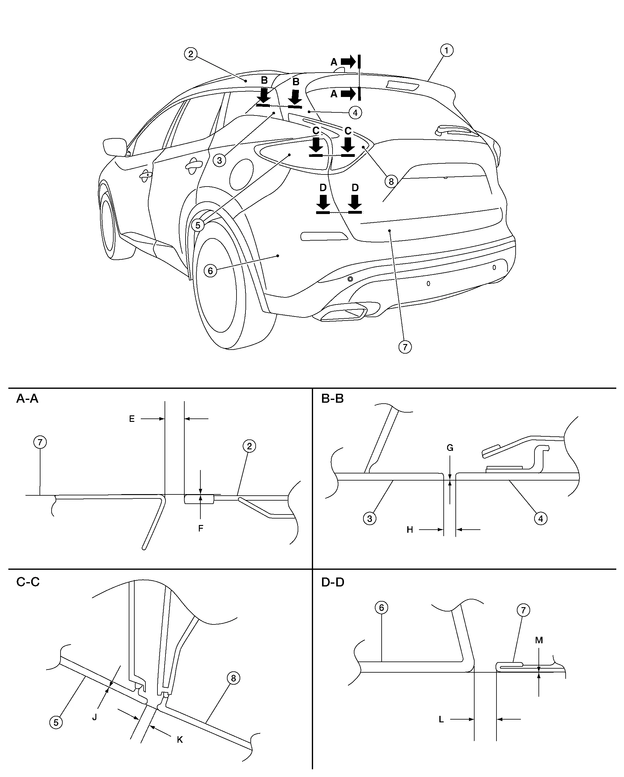 | Rear bumper – Back door | D – D | L | Clearance | 6.0 ± 1.9 (0.19 ± 0.08) | 2.0 (0.08) |