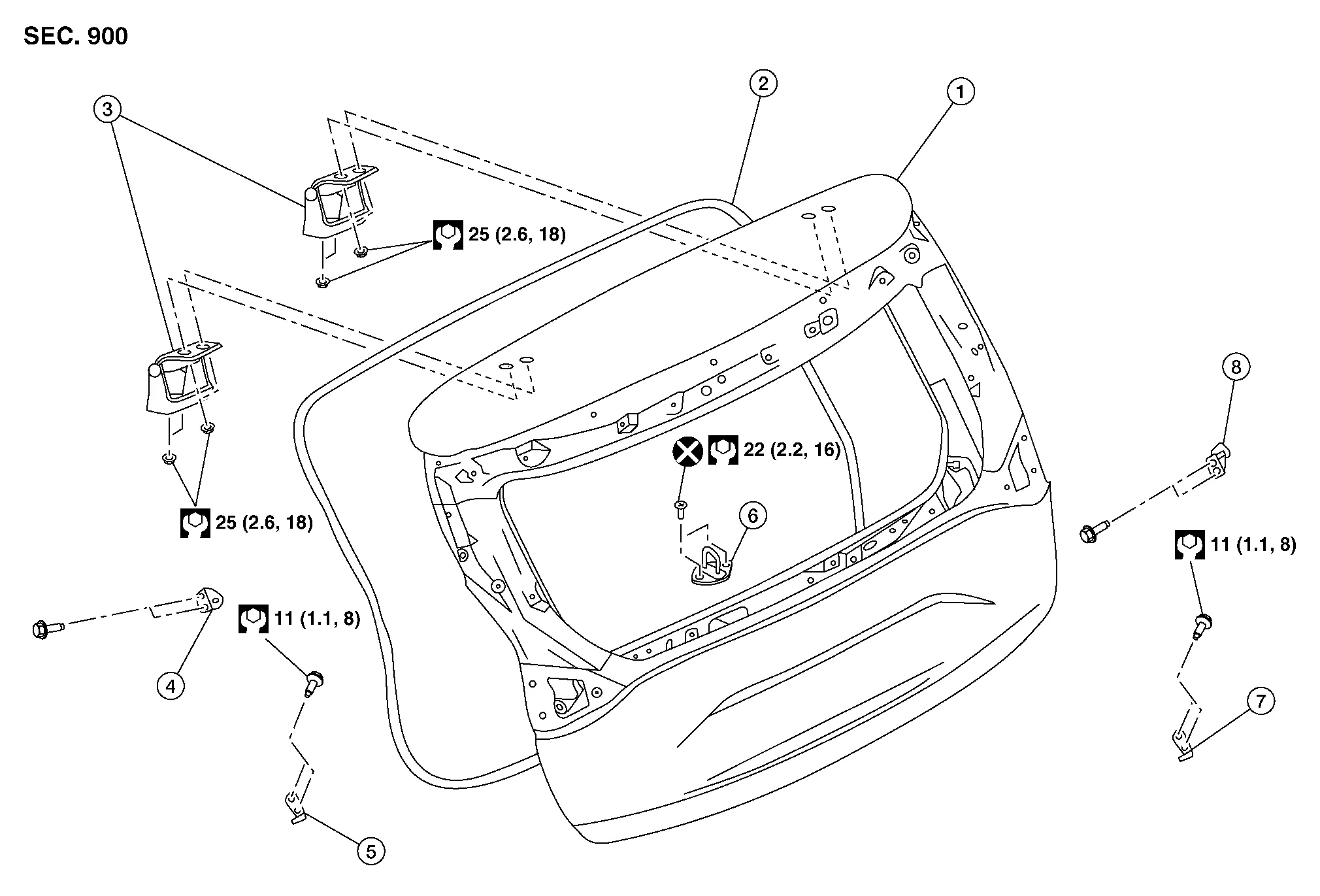 | 7. | Back door lower stud ball or spindle unit upper hinge (with power back door) (RH) | 8. | Back door upper stud ball or spindle unit lower hinge (with power back door) (RH) |