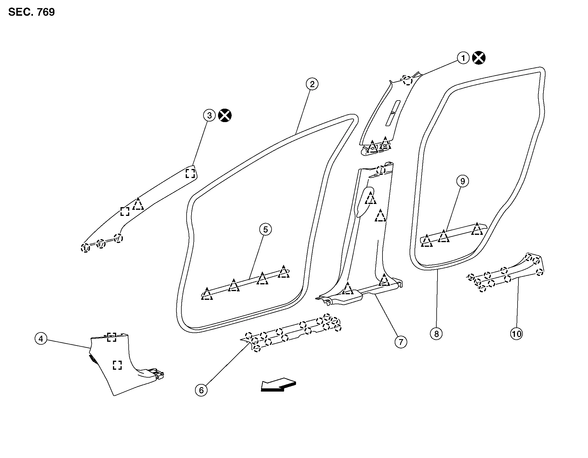 | 7. | Center pillar lower finisher | 8. | Rear door welt | 9. | Rear outer kicking plate |