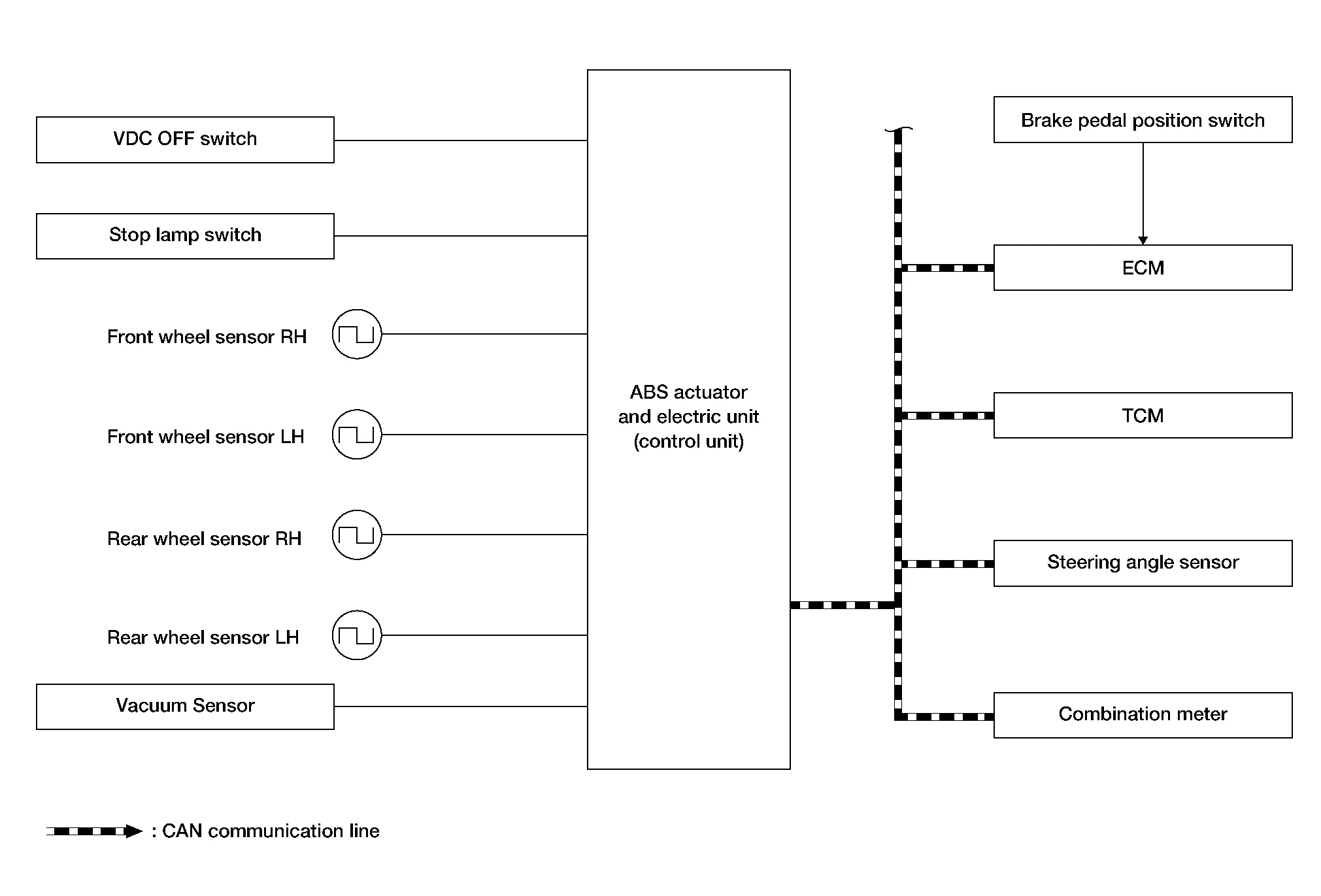 Mainly receives the following signal from ABS actuator and electric unit (control unit) via CAN communication: