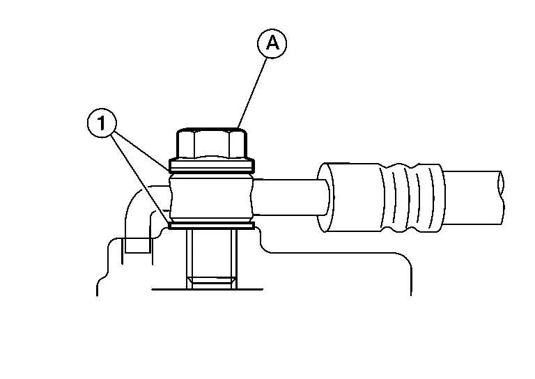 Assemble the union bolt (A) and the copper sealing washers (1) to the brake hose and install it as an assembly to the brake caliper. Align the brake hose L-pin by aligning it with the brake caliper hole, and tighten the union bolt (1) to the specified torque.