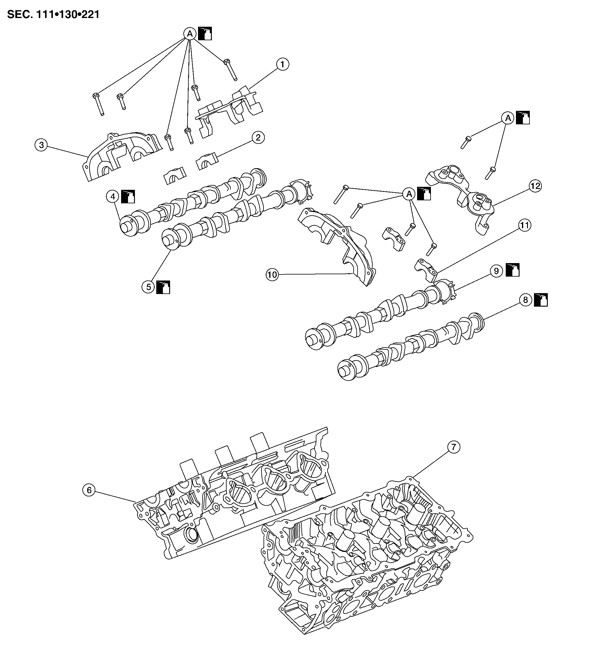 | 4. | Camshaft (EXH) (bank 1) | 5. | Camshaft (INT) (bank 1) | 6. | Cylinder head (bank 1) |