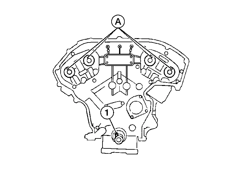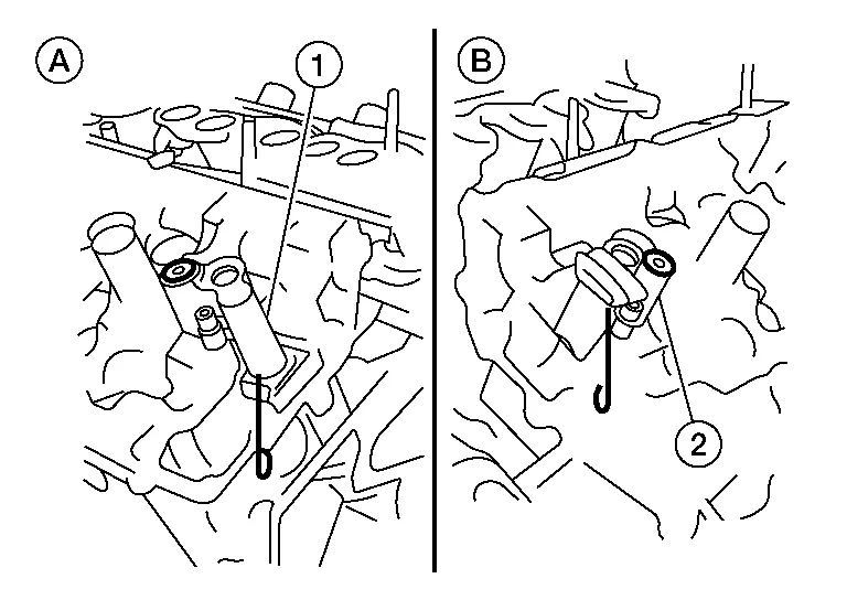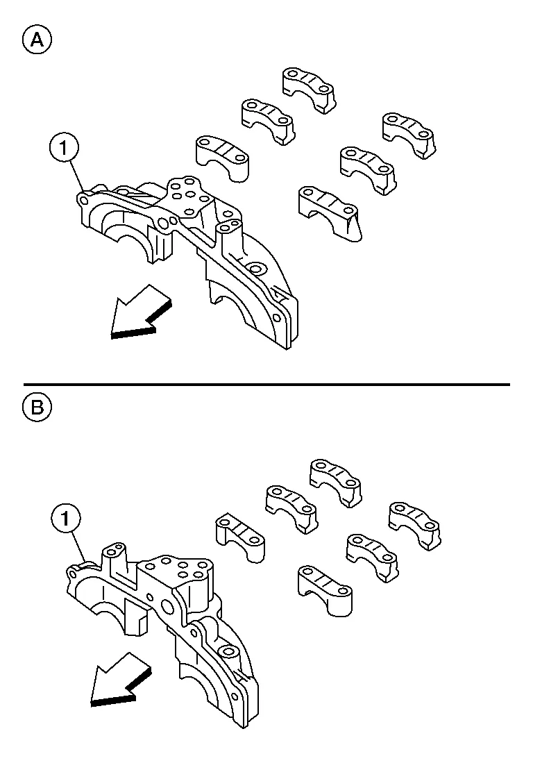 Install camshaft chain tensioners (1/2) at bank 1 (A) and bank 2 (B). Refer to Exploded View.