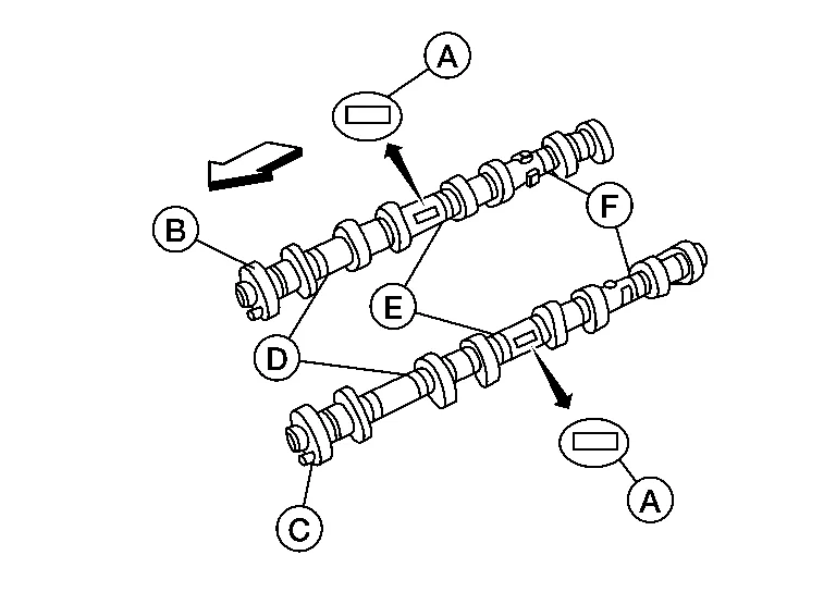 Remove the intake and exhaust camshaft brackets (bank 2) (B) and the camshafts (bank 2) (A/C).