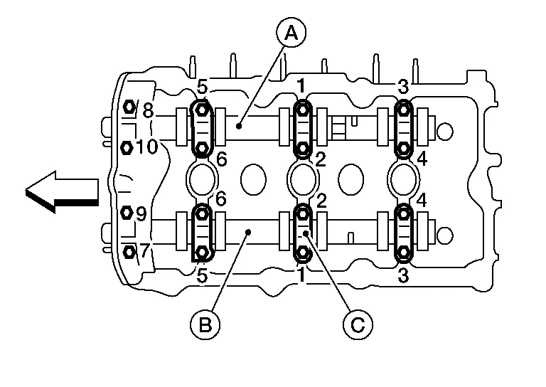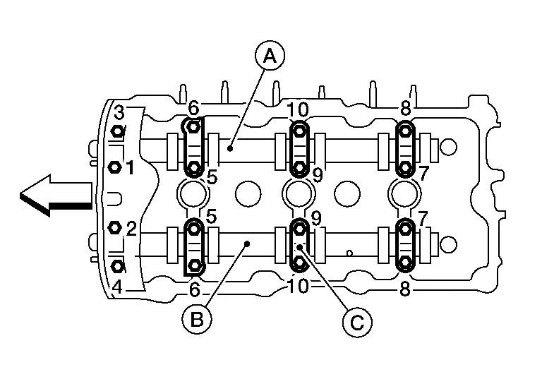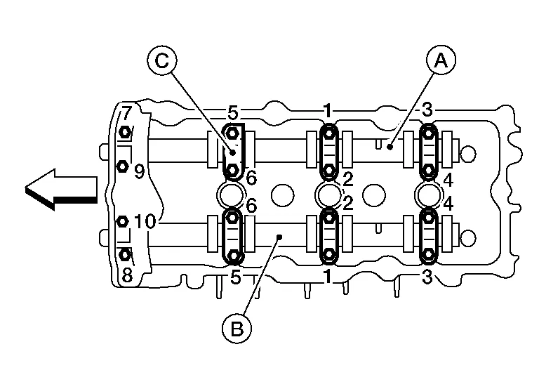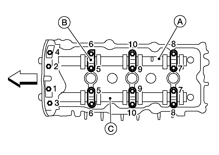 Locate the camshaft (EXH) (bank 1) (A) and camshaft (INT) (bank 1) (B). Tighten the camshaft brackets (C) in the three steps, in numerical order as shown.