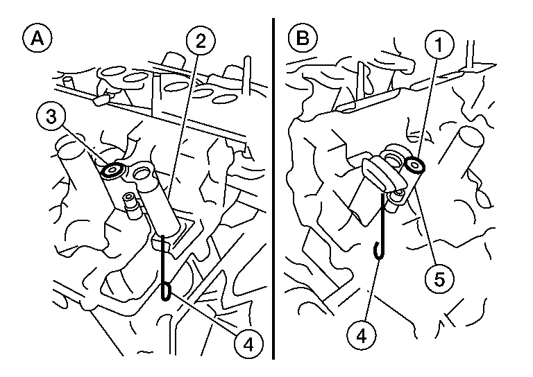 Remove secondary tensioner (2/5) with its stopper pin (4) attached.