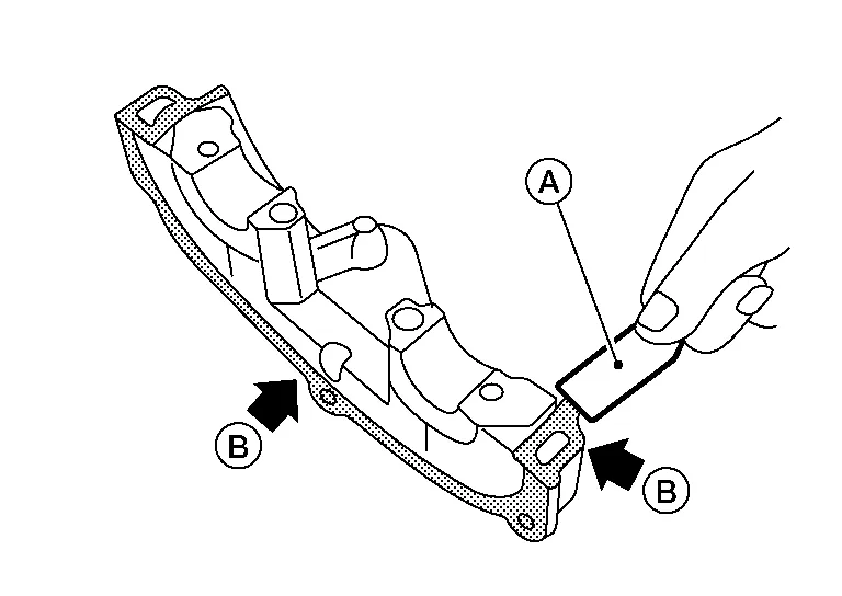 Before installing the front cam bracket, remove the old Silicone RTV Sealant (B) from the mating surface using a suitable tool (A).