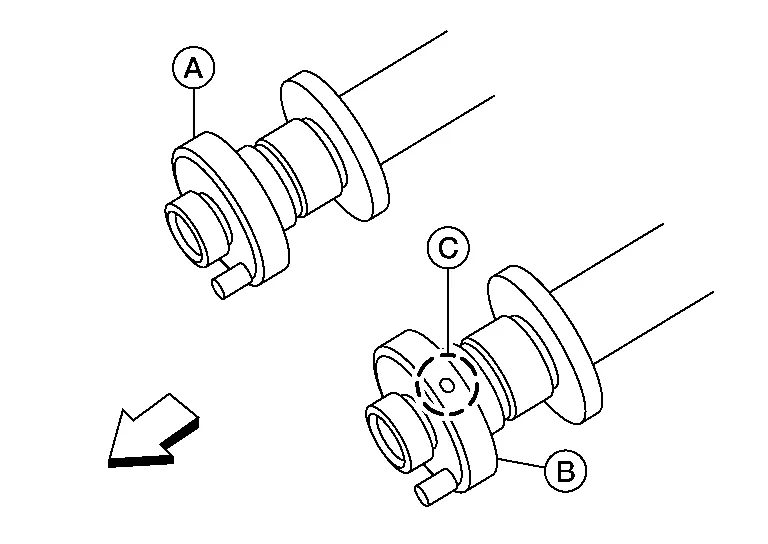 Intake camshaft has a drill mark (C) on camshaft sprocket mounting flange.