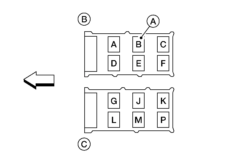 Install bank 1 (B) and bank 2 (C) camshaft brackets in their original positions and direction. Align the stamp marks (A) as shown.