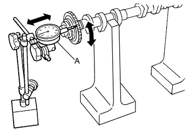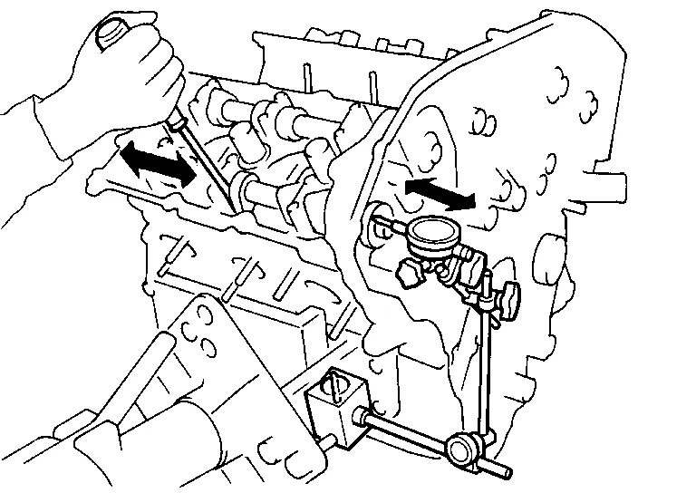Install dial gauge in thrust direction on front end of camshaft. Measure end play when camshaft is moved forward/backward (in direction to axis) as shown. Refer to Camshaft.