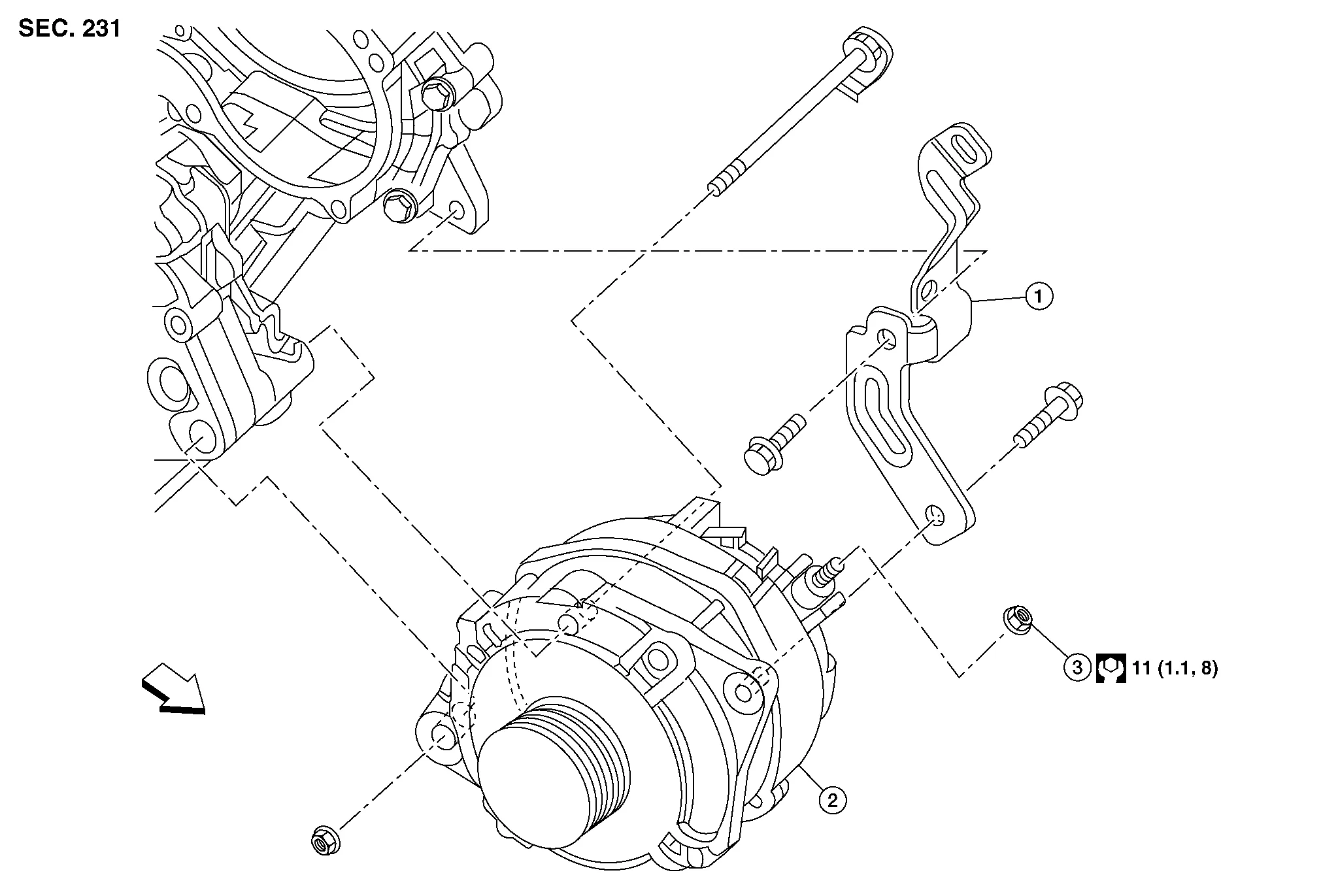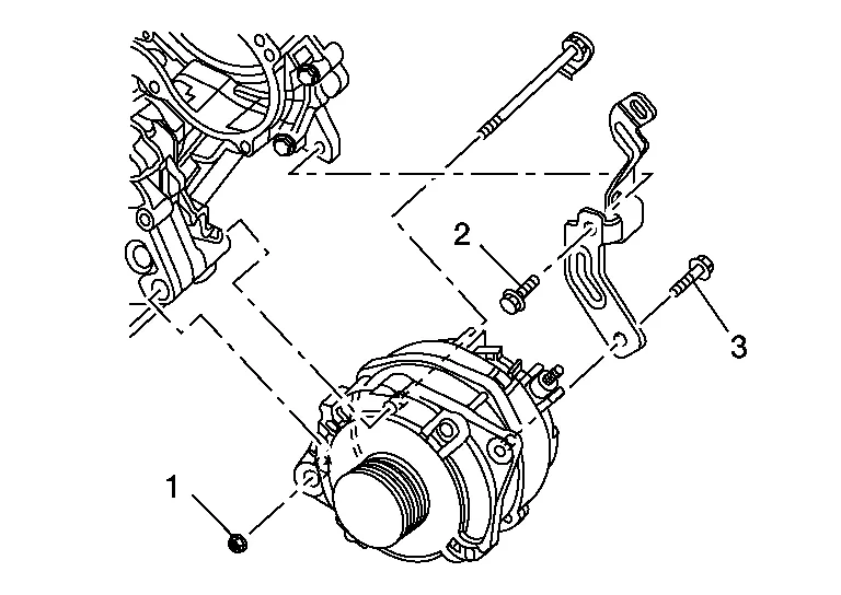 | 1. | Generator bracket | 2. | Generator | 3. | "B" terminal nut |