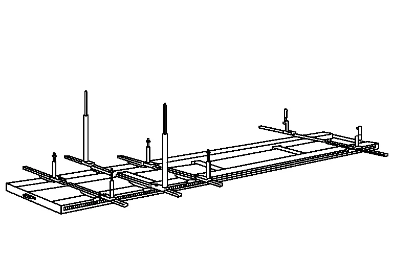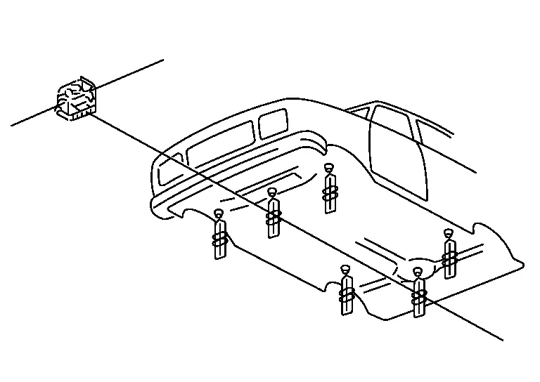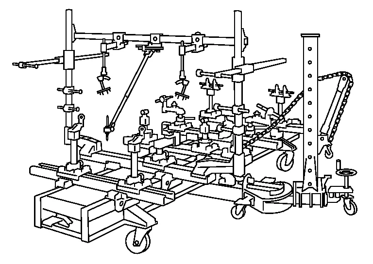 This is one of the universal jig type body straightening equipment functions. The jig is assembled according to the instruction card specific to each Nissan Murano vehicle model. The jig, which can move forward/backward, left/right, and up/down, is anchored to each location on the underbody. The three-dimensional coordinates for the anchored point are read from the scale at the sliding base and jig head positions.