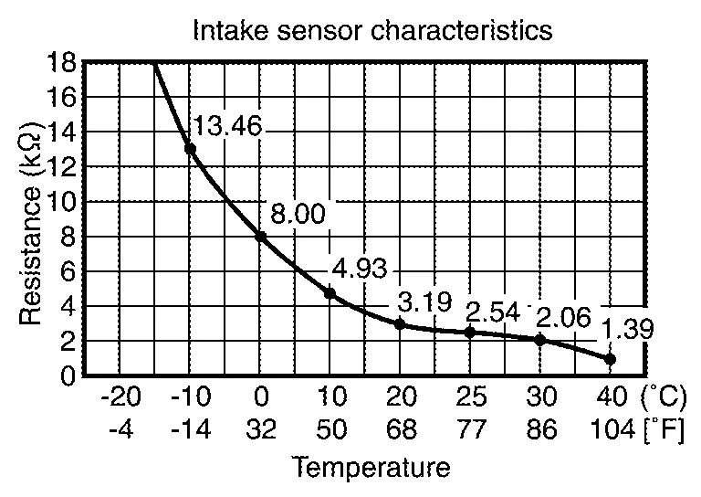Intake sensor measures temperature of evaporator fin temperature. The sensor uses a thermistor which is sensitive to the change in temperature. The electrical resistance of the thermistor decreases as temperature increases.