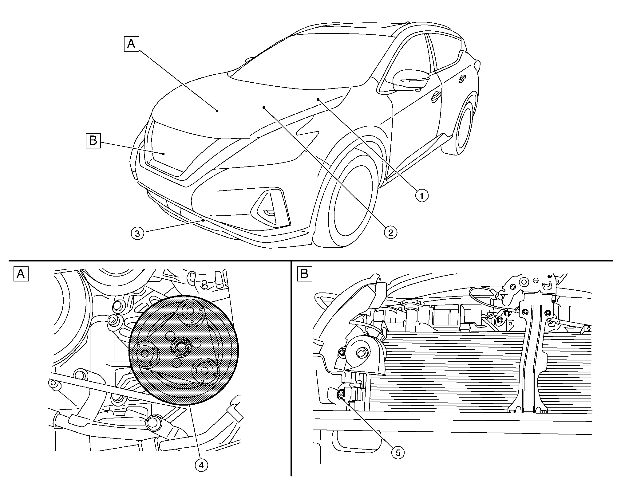 | A. | RH front of engine compartment | B. | View with front fascia removed from Nissan Murano vehicle |