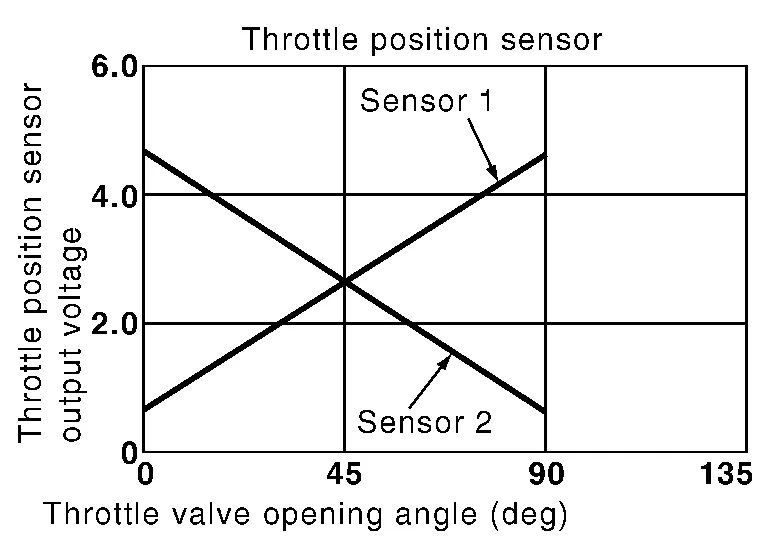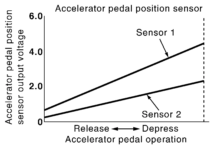Accelerator pedal position sensor has two sensors. These sensors are a kind of potentiometers which transform the accelerator pedal position into output voltage, and emit the voltage signal to the ECM. In addition, these sensors detect the opening and closing speed of the accelerator pedal and feed the voltage signals to the ECM. The ECM judges the current opening angle of the accelerator pedal from these signals and controls the throttle control motor based on these signals.