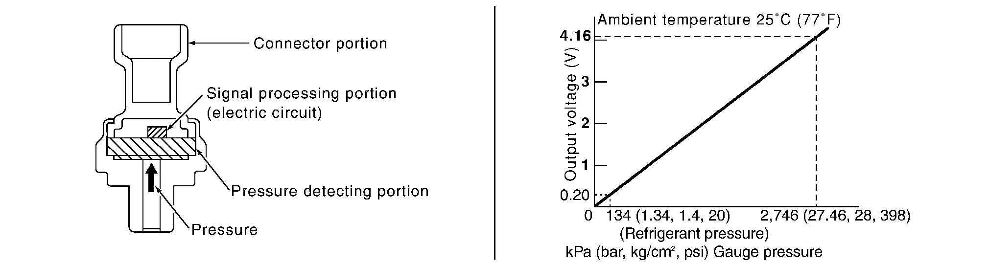 The refrigerant pressure sensor is installed at the condenser of the air conditioner system. The sensor uses an electrostatic volume pressure transducer to convert refrigerant pressure to voltage. The voltage signal is sent to ECM, and ECM controls cooling fan system.