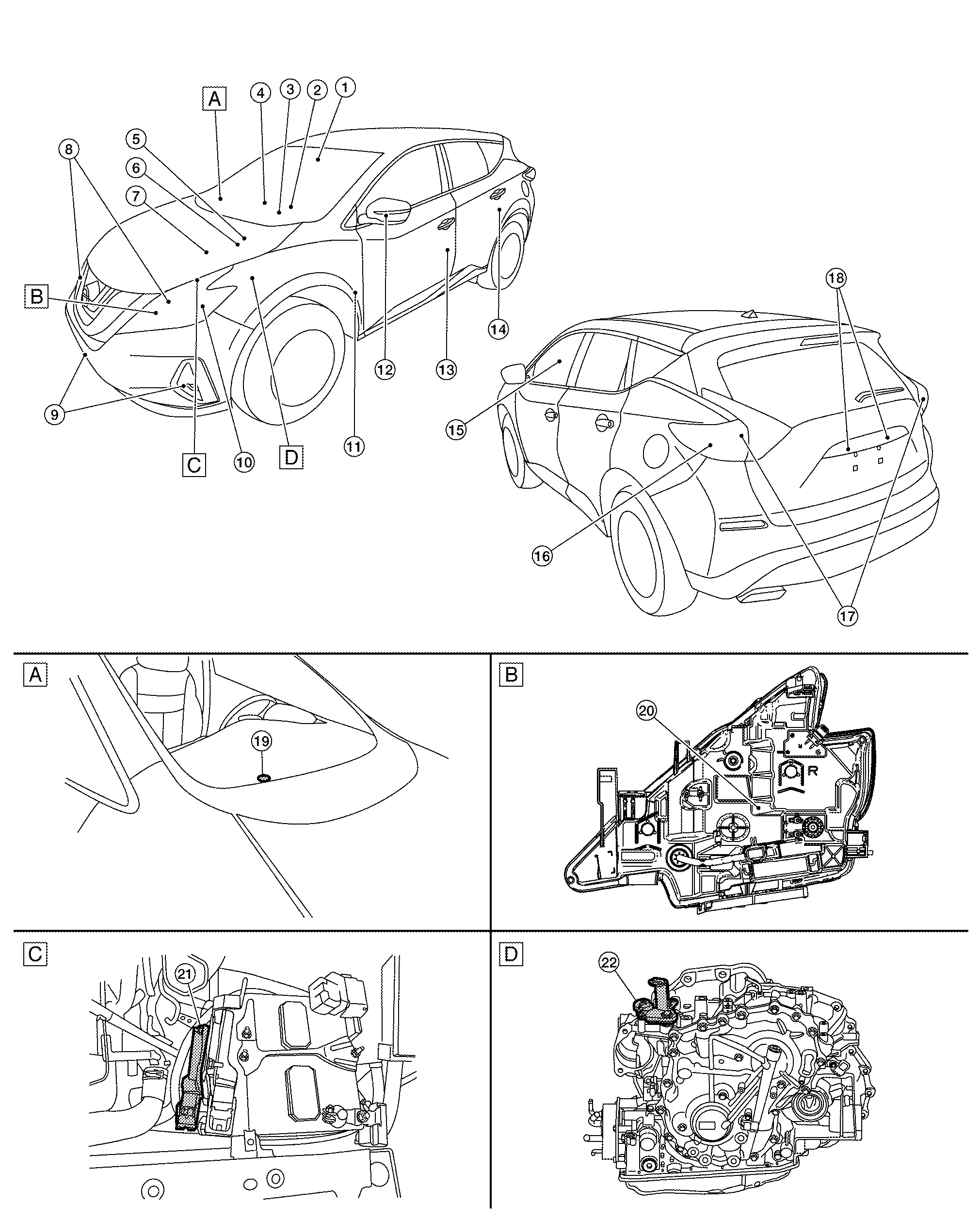 Controls back-up lamps ON/OFF when operated by CVT shift selector. Refer to TCM for detailed component location. |