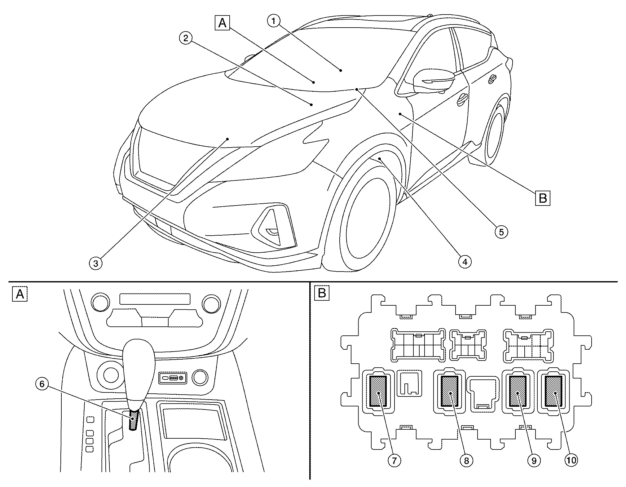 | A. | Front of center console | B. | Instrument lower panel LH |