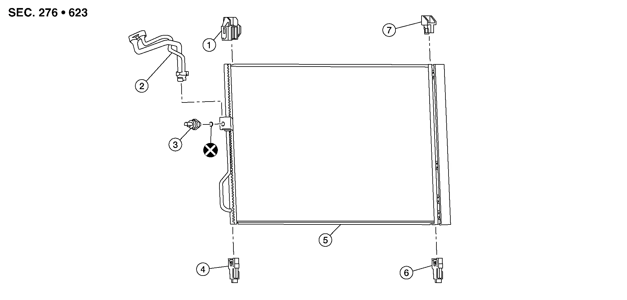 | 4. | Condenser lower bracket (RH) | 5. | Condenser (includes liquid tank) | 6. | Condenser lower bracket (LH) |