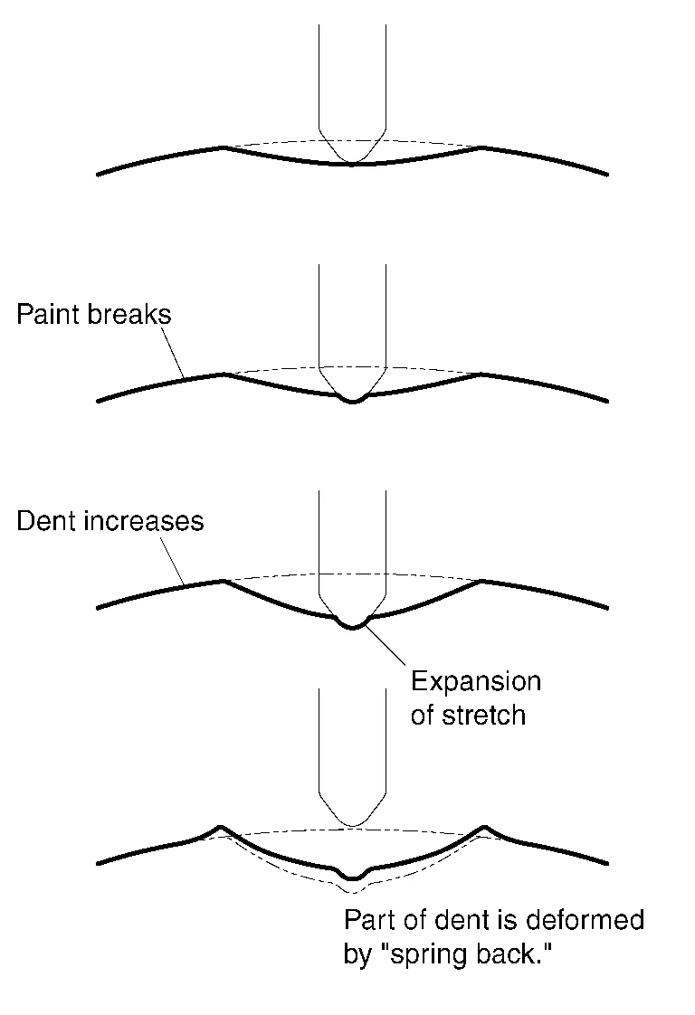 Removing the cause of the dent can simplify the entire repair operation. Plastic deformation can be recognized by sharp bending, a nick, or cracked or peeled paint.