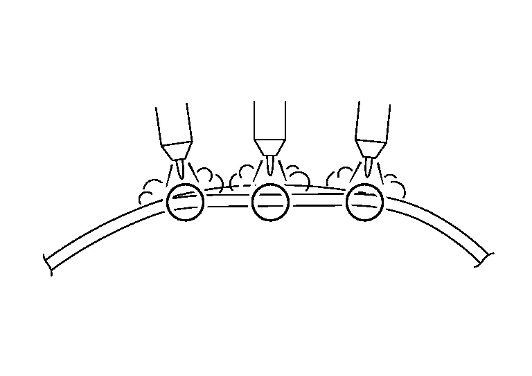 (d) Use a hammer and dolly by the hammer-on-dolly method. Stretch the panel while striking the outer area of the damaged portion. The entire panel surface should be formed somewhat higher than the original surface. Note that, in this case, the stretched portion of the panel must not be hit with the hammer.