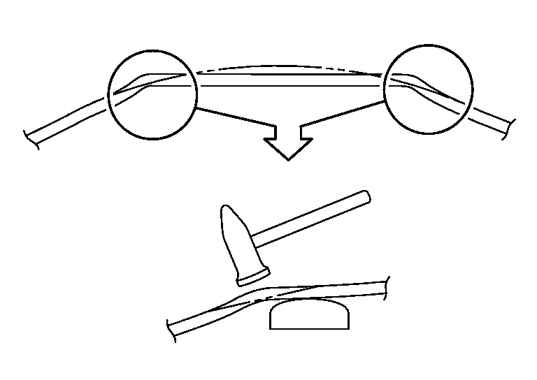 (b) Repair the plastic deformed portion using the hammer-off-dolly method. If a shrinking hammer is available, the stretched portion can be easily shrunk.