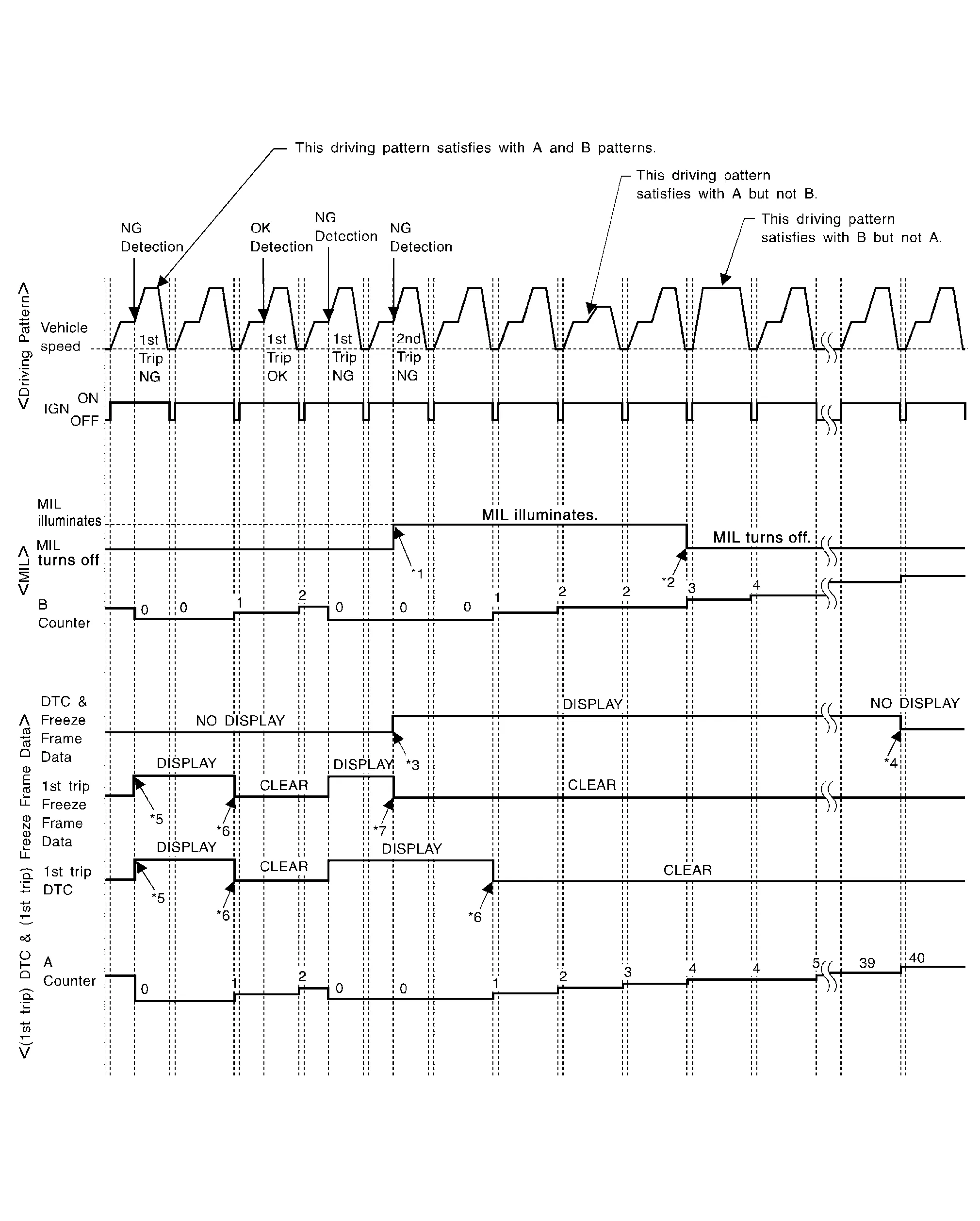 | *4: | The DTC and the freeze frame data will not be displayed any longer after Nissan Murano vehicle is driven 80 times (pattern C) without the same malfunction. (The DTC and the freeze frame data still remain in ECM.) | *5: | When a malfunction is detected for the first time, the 1st trip DTC and the 1st trip freeze frame data will be stored in ECM. | *6: | The 1st trip DTC and the 1st trip freeze frame data will be cleared at the moment OK is detected. |