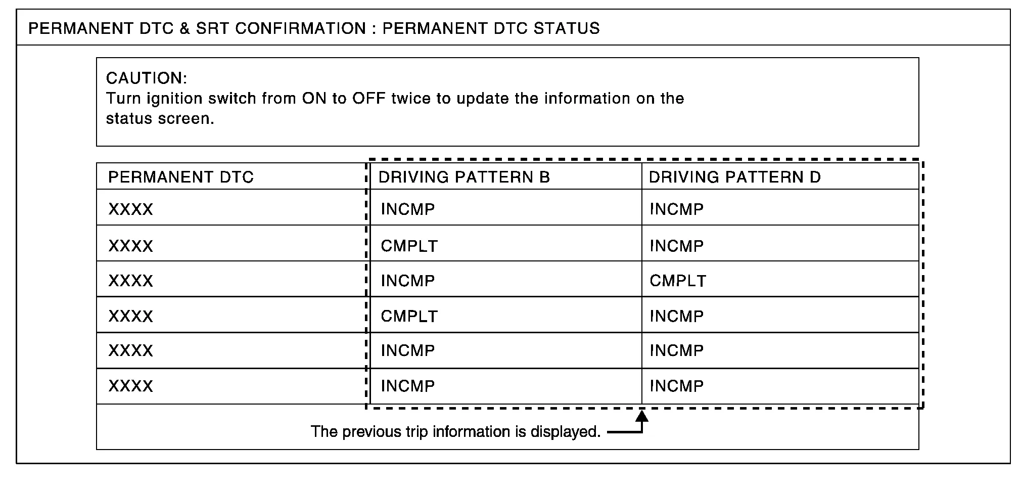 Permanent DTCs stored in ECM memory are displayed on the CONSULT screen to show if a driving pattern required for erasing permanent DTCs is complete (CMPLT) or incomplete (INCMP).