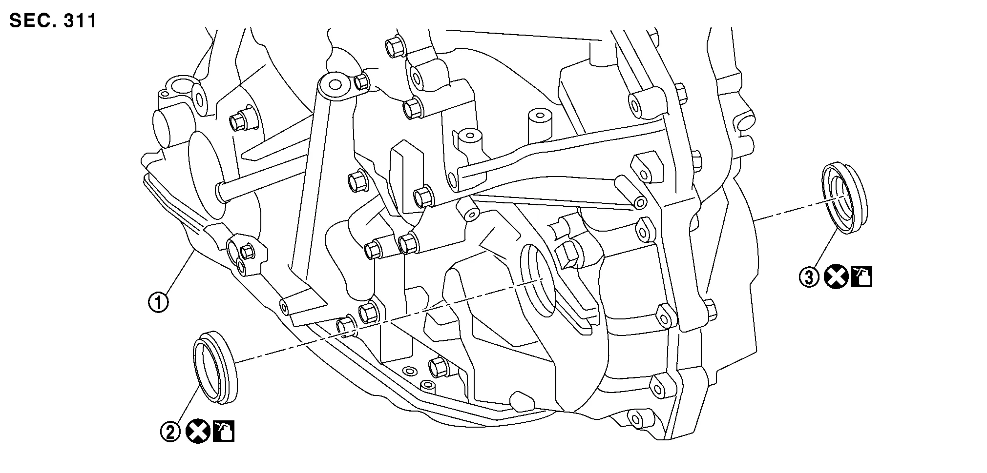 | 1. | Transaxle assembly | 2. | Differential side oil seal (left side) | 3. | Differential side oil seal (right side) (FWD models only) |