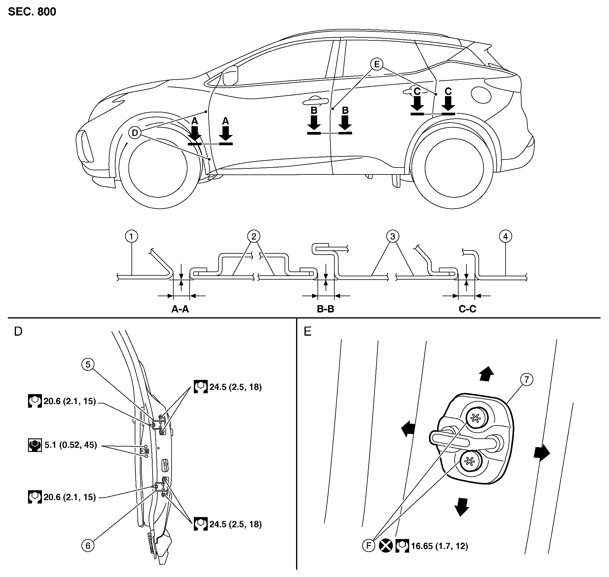 | Front door - Rear door | B – B | Clearance | 4.0 ± 1.0 (0.16 ± 0.04) |