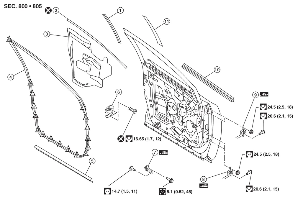| 7. | Front door check link | 8. | Front door lower hinge | 9. | Front door upper hinge |