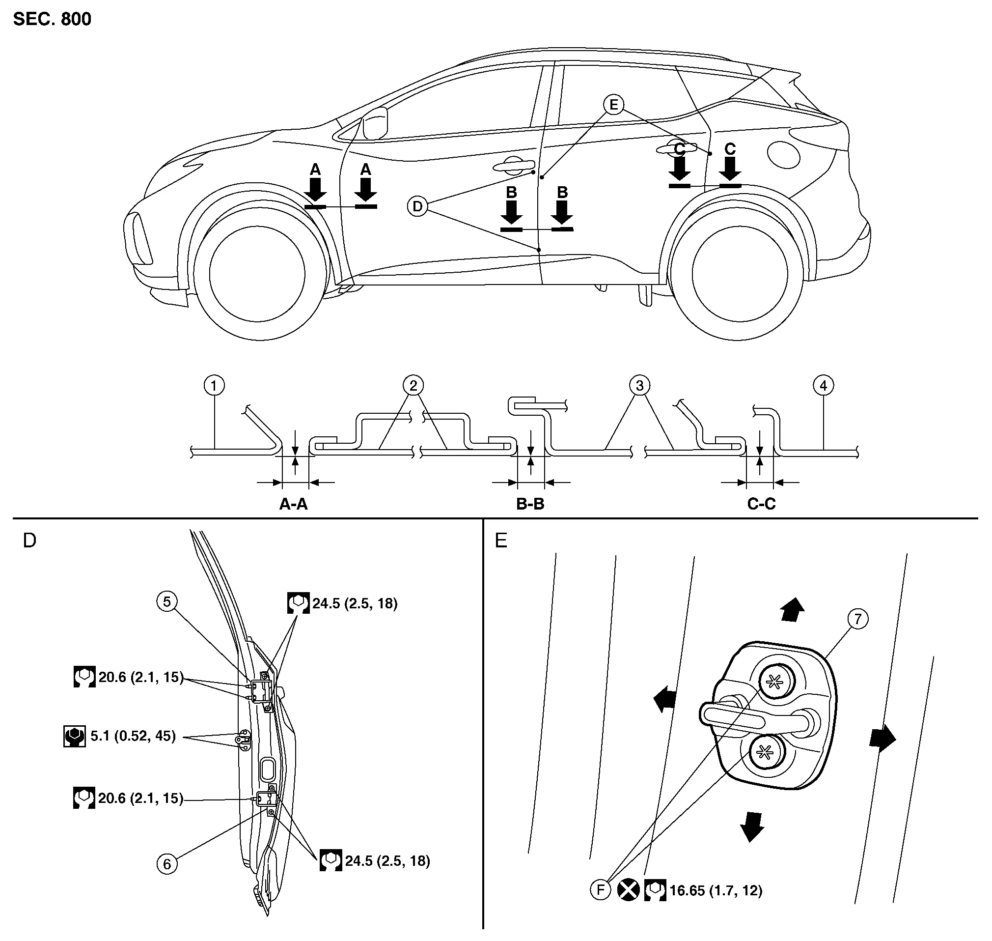 | Rear door - Body side outer | C – C | Clearance | 3.2 ± 1.0 (0.13 ± 0.04) |