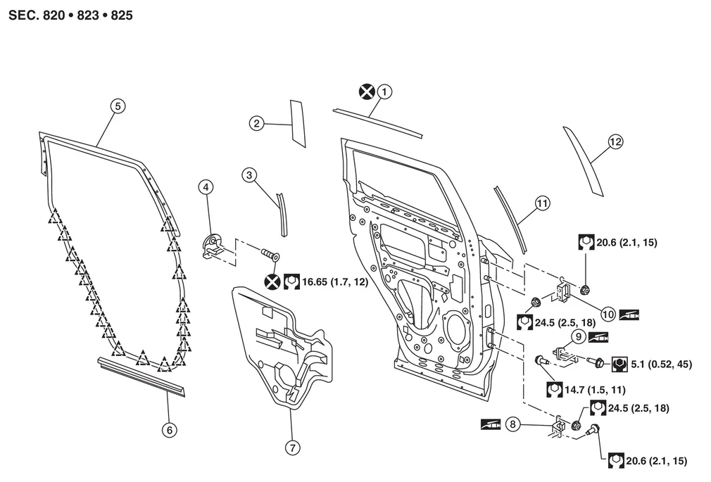 | 10. | Rear door upper hinge | 11. | Rear door sash front tape | 12. | Rear door outside front tape |