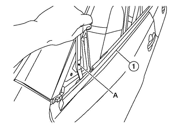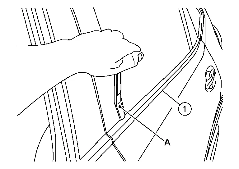 Release front pawl then rear pawl using a suitable tool (A) and remove rear door outside molding (1).