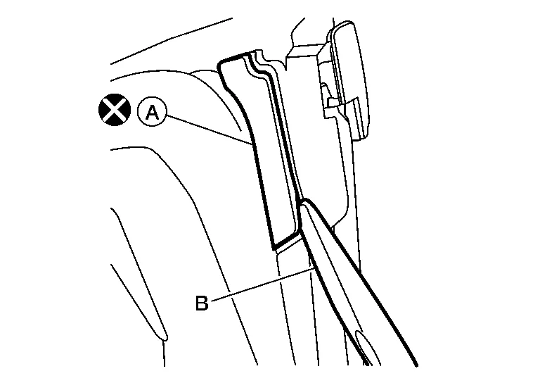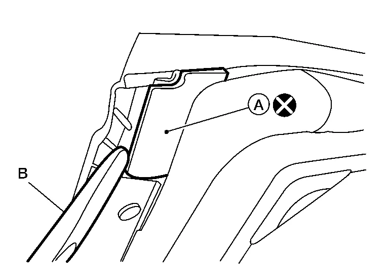 Remove rear door front sash molding clip (A) using a suitable tool (B).