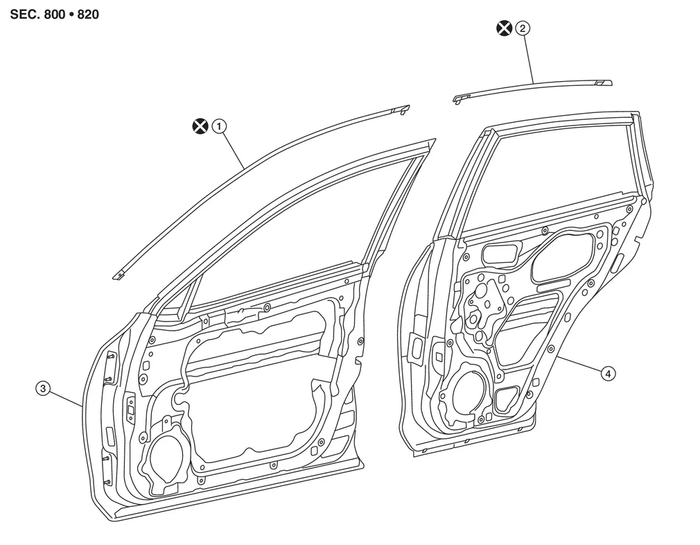 | 1. | Front door sash molding | 2. | Rear door rear sash molding | 3. | Front door panel |