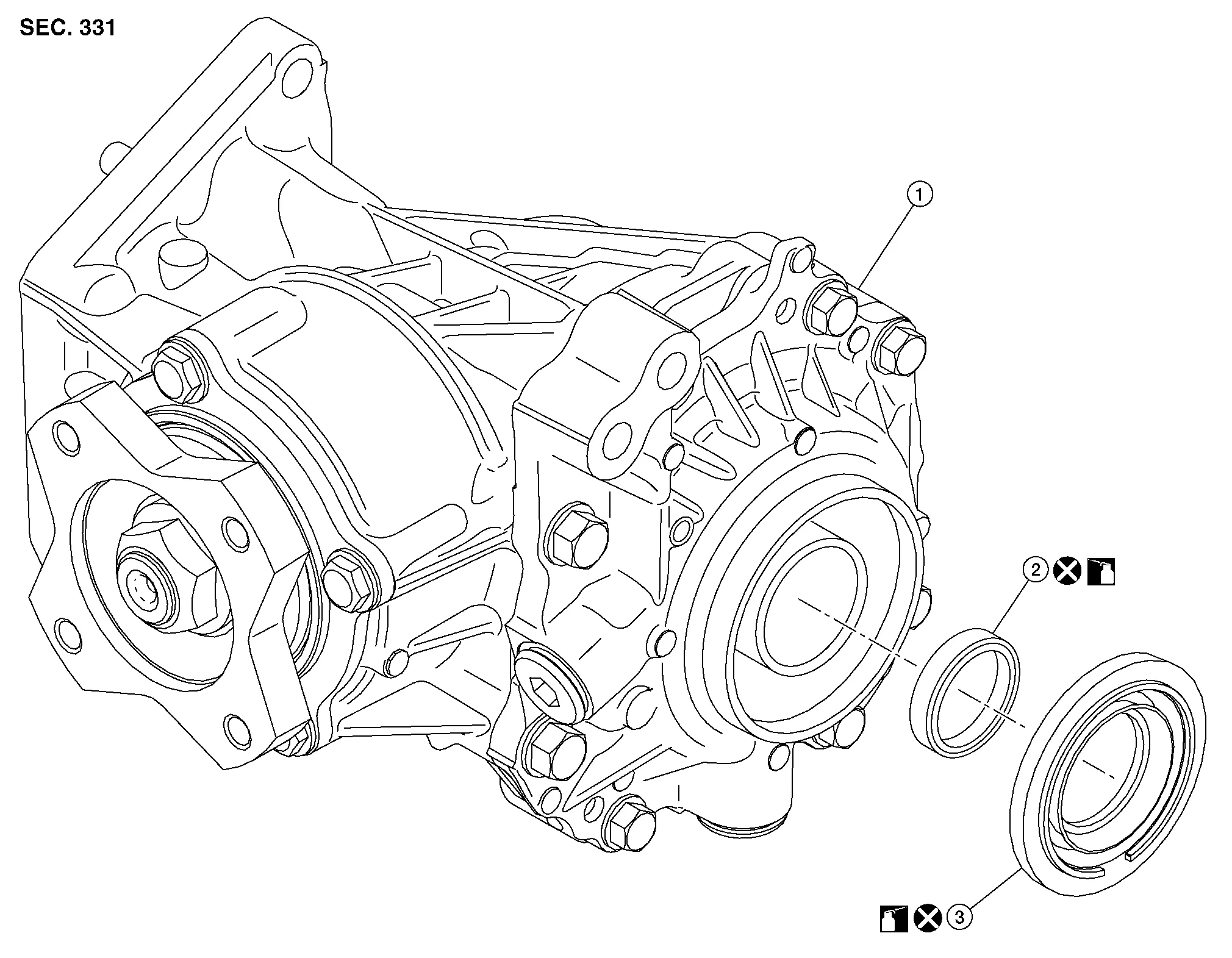 | 1. | Transfer case assembly | 2. | Drive shaft oil seal | 3. | Transfer cover oil seal |
