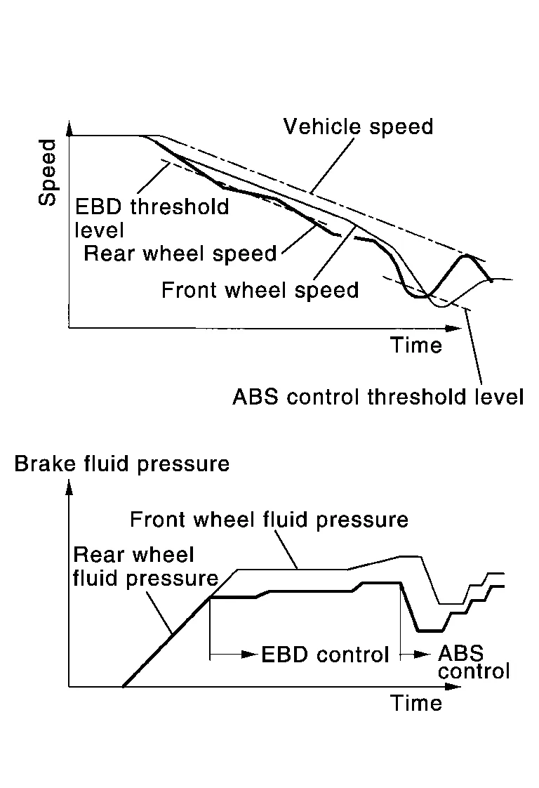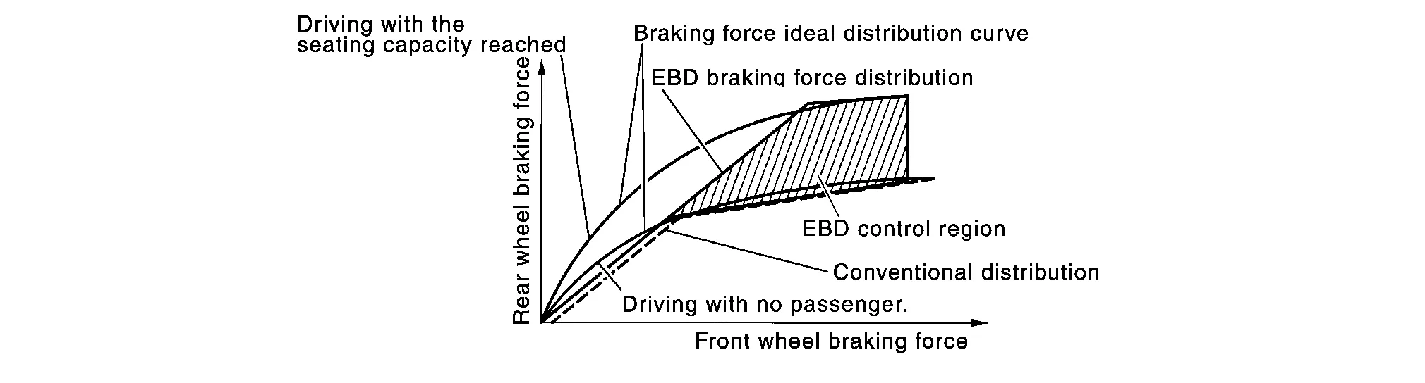 EBD function is expanded and developed from conventional ABS function and corrects rear wheel brake force to appropriate level by electronic control according to load weight (number of passengers).