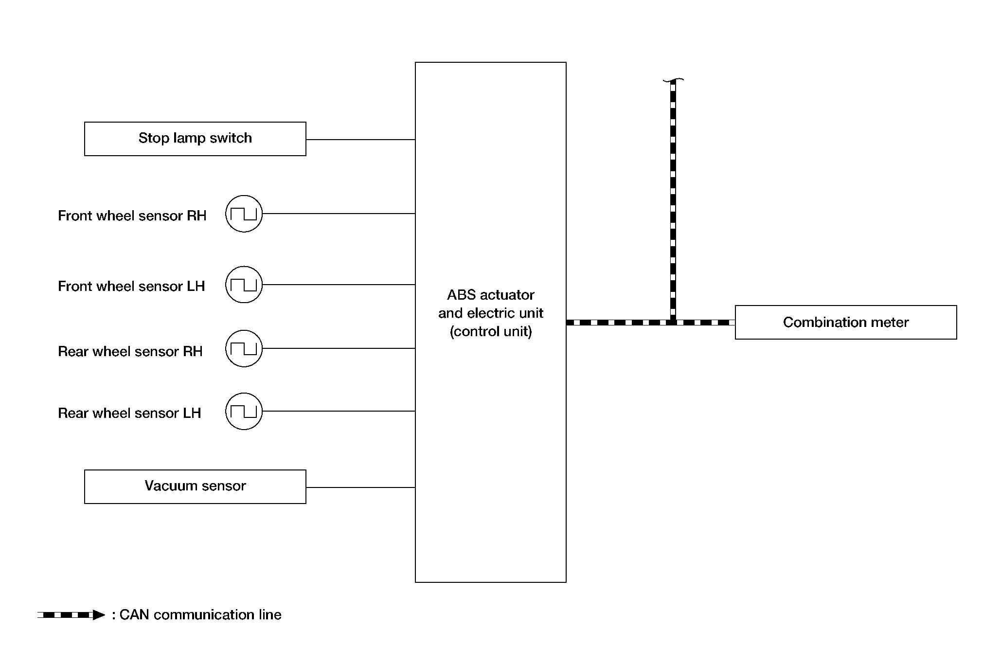 Mainly receives the following signals from ABS actuator and electric unit (control unit) via CAN communication: