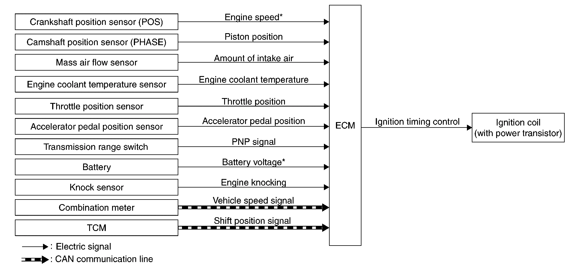 The ECM receives information such as the injection pulse width and camshaft position sensor (PHASE) signal. Computing this information, ignition signals are transmitted to the power transistor.