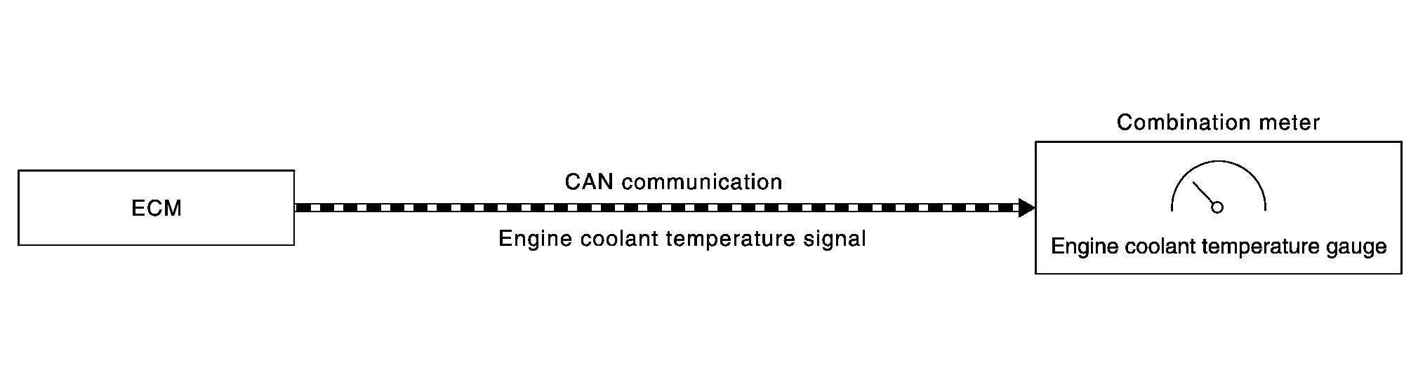 The engine coolant temperature sensor sends an engine coolant temperature signal to the ECM. The ECM provides an engine coolant temperature signal to the combination meter via CAN communication lines. The engine coolant temperature gauge indicates the engine coolant temperature.