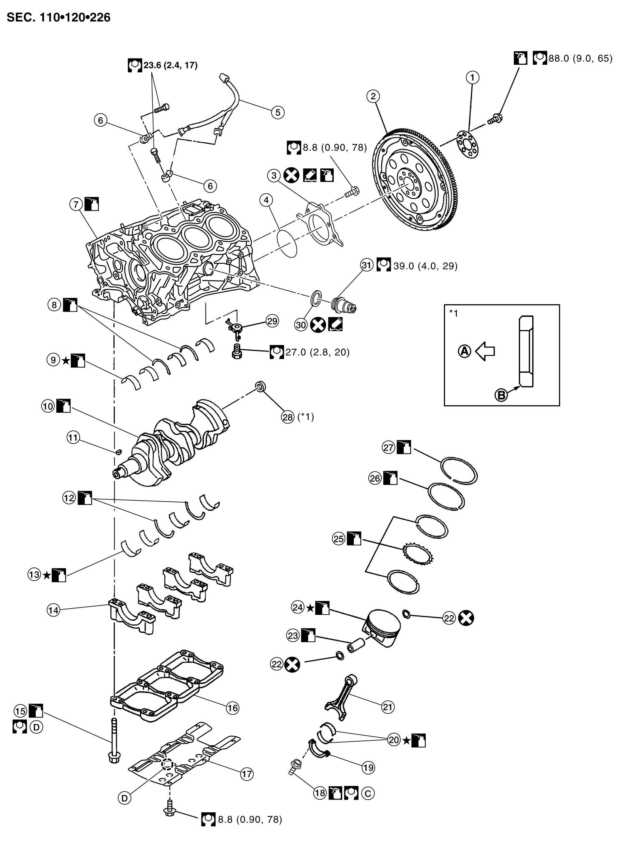 | Water drain plug (D) with copper sealing washer (if equipped) | : 62.0 N·m (6.3 kg-m, 46 ft-lb) |