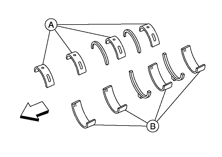 The upper main bearings (A) have an oil groove. The lower main bearings do not have an oil groove.