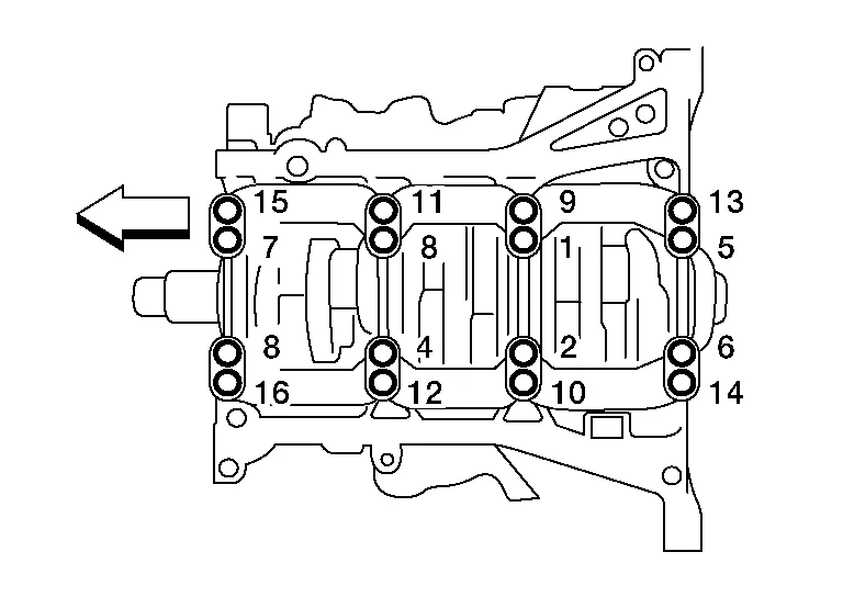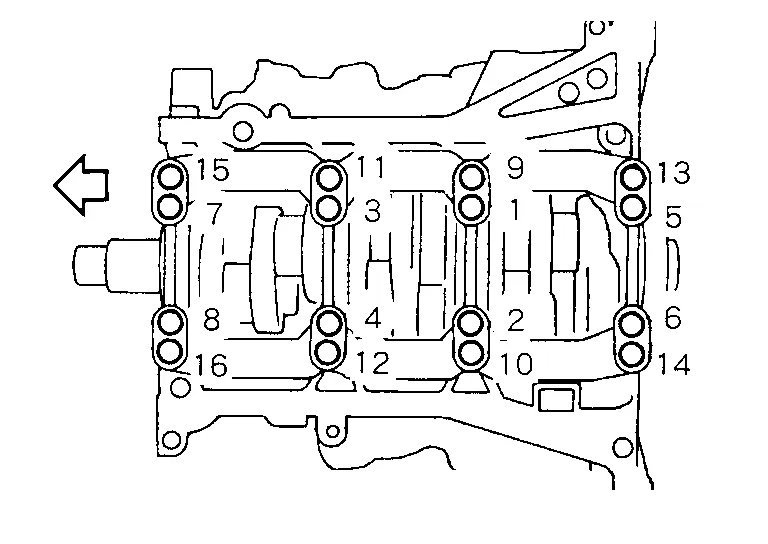 After installing the crankshaft, lower main bearings, main bearing caps, main bearing beam, and bearing cap bolts. Tighten the bearing cap bolts in the numerical order as shown.