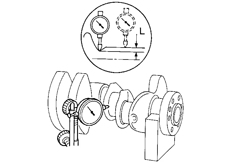 When grinding the crankshaft journal, confirm that the (L) dimension in the fillet role is more than the specified limit. Refer to Cylinder Block.